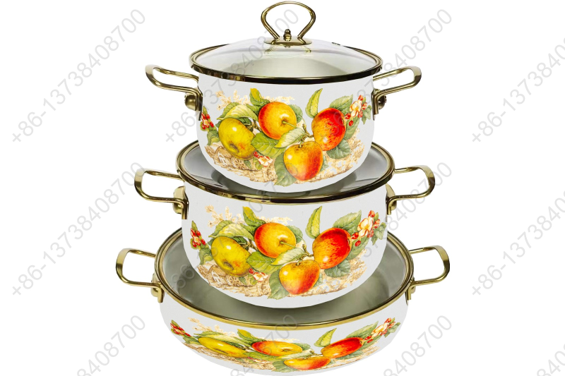 High Quality Enamel Cooking Pot With Glass Lid Enamel Casserole Set With Golden S/S Handles & S/S Knobs & S/S Rim